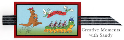 For my card, I am using a couple of Karen's new images. Joey Goes to School and Back to School Set. Using Photoshop Elements, I sized and combined the images, created a gradient background then printed it onto Cryogen paper. As always, I used my Copic markers to color the images. I added a black panel, a black ribbon and a red panel, and I was done.