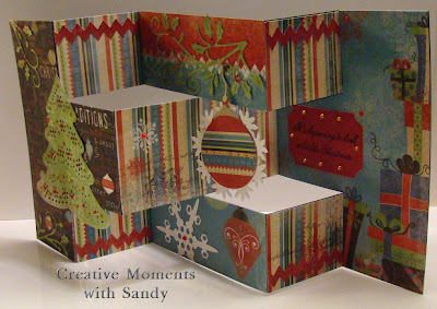For my Cheery Lynn Designs project today, I created a tri-shutter card. It folds up to 4.25 x 5.5 inches. All of the DP is from the Bo Bunny Blitzen 6x6 paper pack. On the front I started with an Elegant Evergreen die, dressed up with some gold and red Viva Decor Pearl pen accents. I added pieces of the new Holly Flourish in the corners (notice the little red berries I added with my pearl pen)
