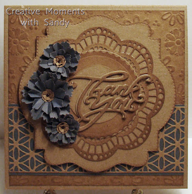 The challenge this week at Cheery Lynn Designs is to use Kraft paper. I began with a Kraft card base 5.5 inches square. I dry embossed a 5.25 inch square Kraft panel with my Daisy Garden embossing plate. I used Frayed Burlap Distress ink to accent the embossed areas. Next came the largest of the new Pierced Stacker #3 set. To the center of that, I added an Ambergris Doily. Behind the Thank You, I layered a Silver Circle Stacker on top, then an Inverted Scalloped Stacker and a matching Circle Stacker on the bottom.